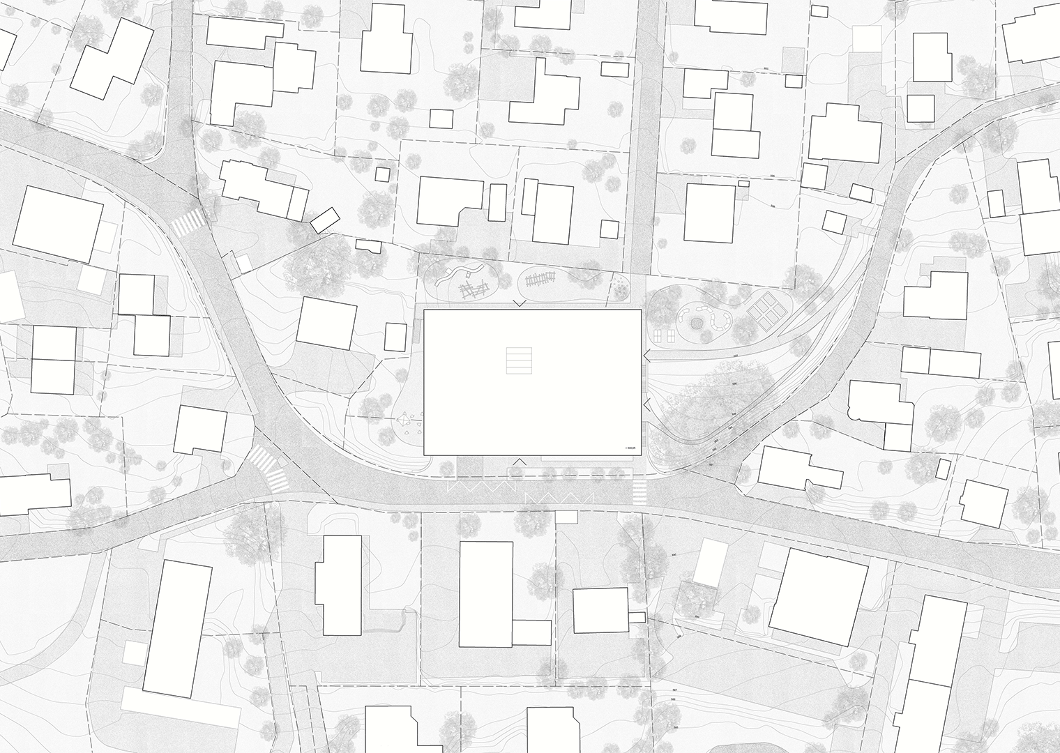 Le site du projet se trouve au point de rencontre de morphologies de formes urbaines diverses. Le nouveau bâtiment recherche la rationalité et prend la forme d’un grand rectangle. Il se met en relation, par sa géométrie et sa position par rapport à la route, avec les ouvrages environnants. Inséré dans le terrain, il permet l’élargissement du gabarit de la route et de ses abords au droit du bâtiment. Cela permet un aménagement optimal de cette dernière avec une séparation des modes de transport. Les piétons disposent de leur aire propre, tandis que la possibilité d’accéder en mobilité douce à l’ouvrage est favorisée et sécurisée. L’accent est mis sur les arrêts de bus et sur les points d’entrée à l’ouvrage dédiés aux piétons et aux vélos.